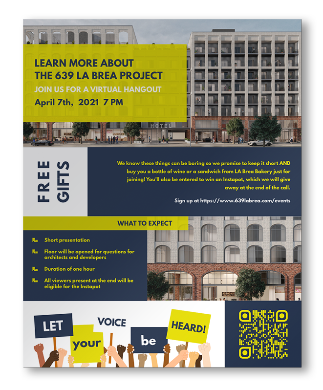 The visual identity for 639 La Brea centered on creating a bold, attention-grabbing visual system that could cut through a crowded civic landscape. A commanding all-caps typographic style, strong color blocking, and simple, high-contrast elements were used to ensure the messaging was clear and immediately legible.